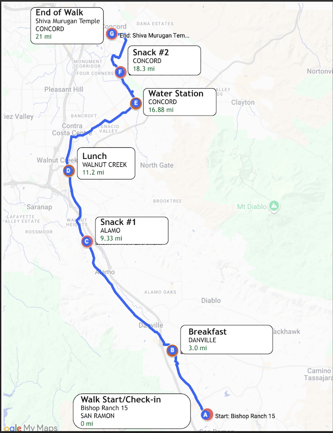 The Concord Shiva Murugan Temple is organizing a walk to the temple to celebrate Sashti. This is a longer 21 miles walk route starting from Bishop Ranch 15, San Ramon, CA.